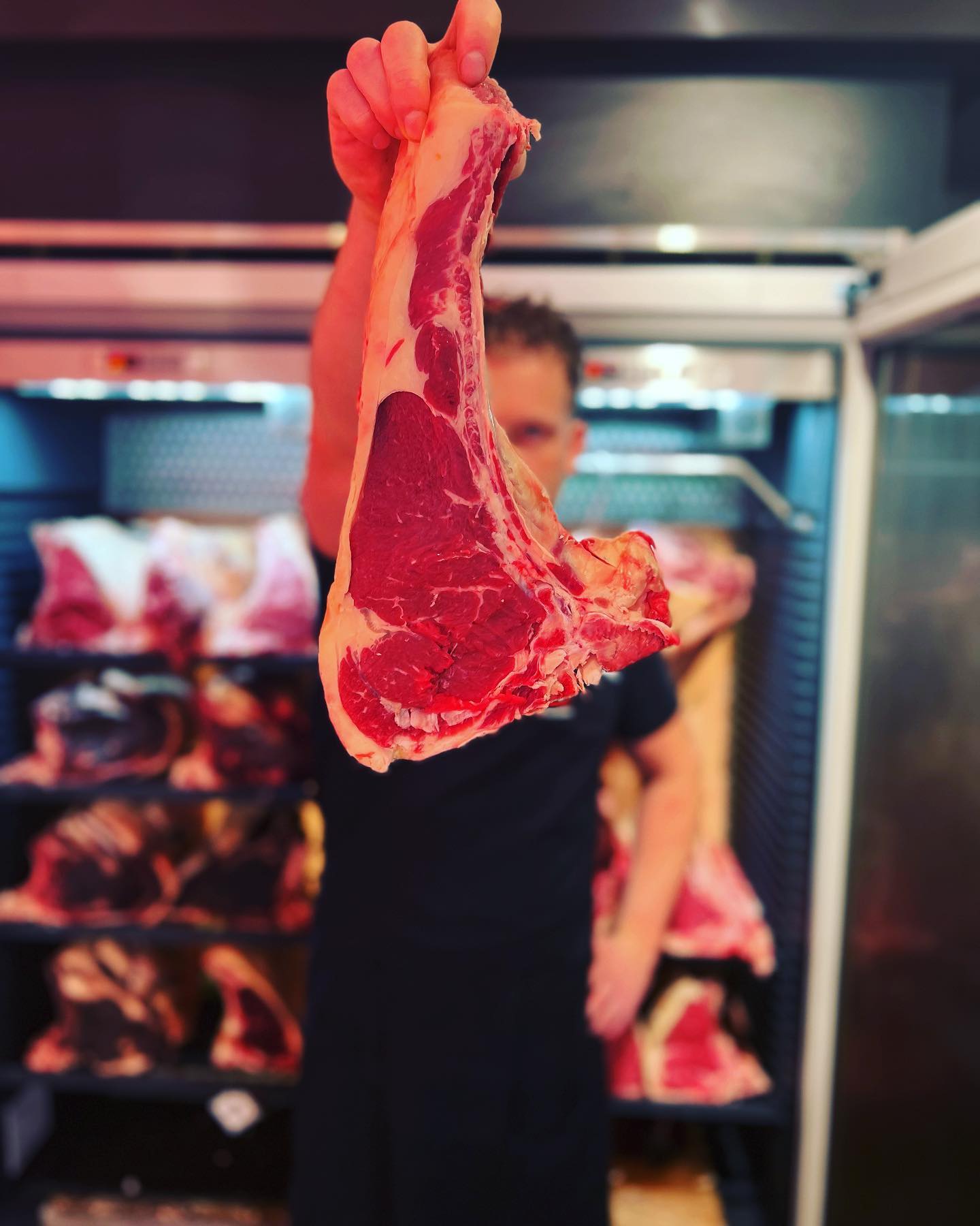 ''Tomahawksteak. Wat een prachtig en vooral lekker stuk vlees is dit toch, van het Rietvelderrund 100%.'' - promotie van Slagerij/boerderij Rietveld